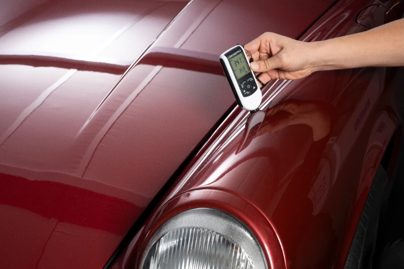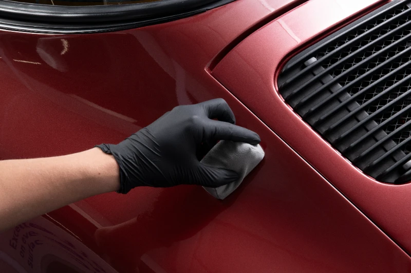 Nach der Politur wird der Lack gründlich entfettet. Mit silikon- und wachsentfernergetränkten Mikrofasertüchern werden alle Oberflächen gereinigt und für die Versiegelung vorbereitet. Anschließend folgt die Handarbeit: Mit Polierpuck und Wachs wird der Lack bauteilweise in kreisenden Bewegungen eingerieben, geglättet und nach 10–15 Minuten auf Hochglanz auspoliert. Es entsteht eine geschlossene, spiegelnde Schutzschicht, die Wasser, Schmutz und UV-Licht abweist.