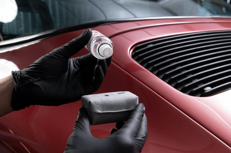 Nanoversiegelung: Hierbei wird das Mittel abschnittsweise per Hand oder mit Exzenter aufgetragen und 2–3 Minuten überlappend einpoliert, bis ein tropfenfreier Film entsteht. Nach kurzer Ablüftzeit wird manuell nachpoliert – das Ergebnis: hydrophob, glatt und dauerhaft glänzend.
